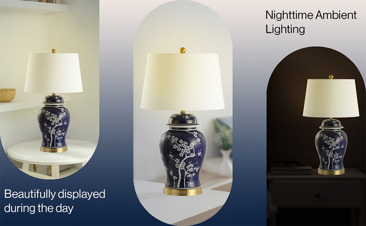 This table lamp is hand-painted and glazed with a cherry blossom motif and then finished with antiqued brass ornamentation. A classic chinoiserie shape, this large ginger jar base is sure to make a statement on a console or buffet. Finished with a brass finial and cotton drum shade on the top and a silk-wrapped cord in the back, it's the perfect addition to your traditional space.