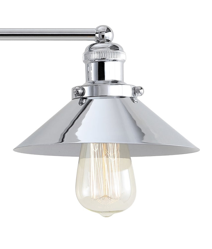 - Orb-finished cone shades add industrial charm to the classic barn-style light
