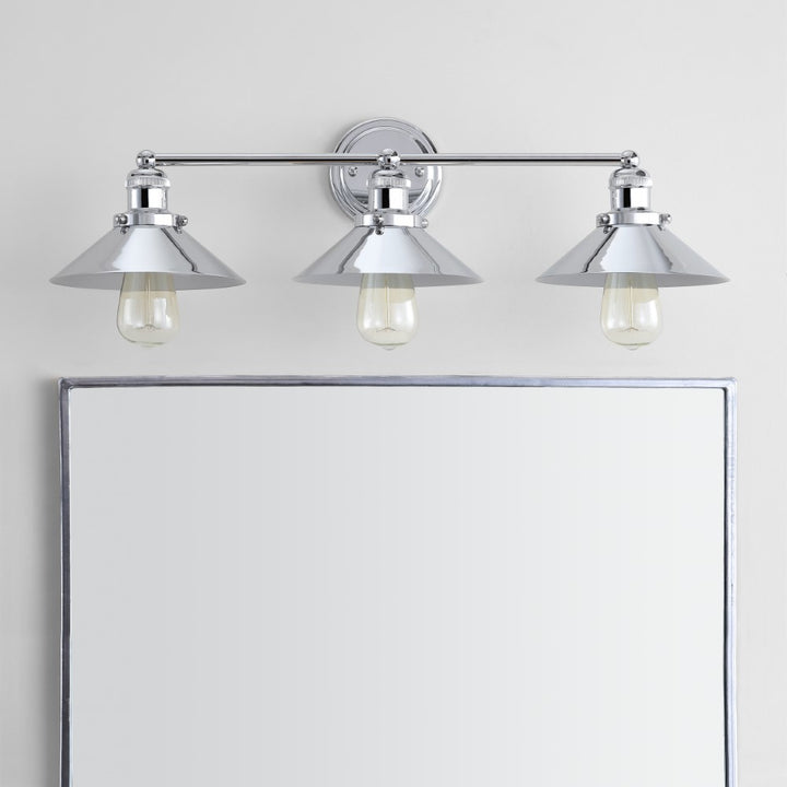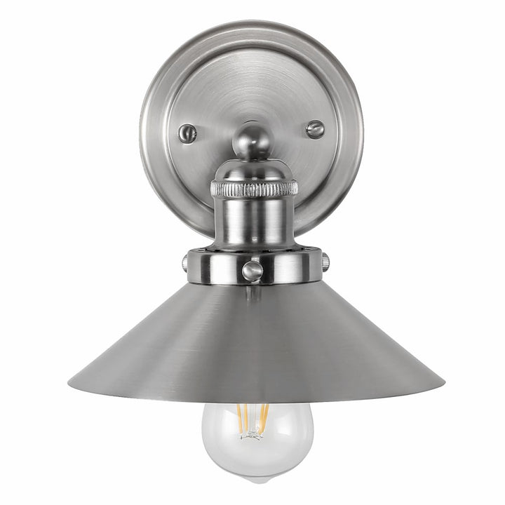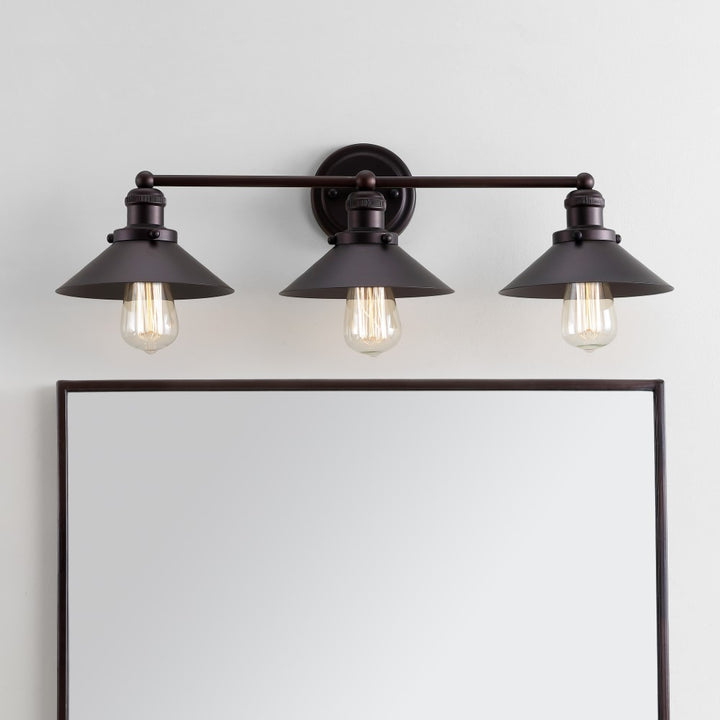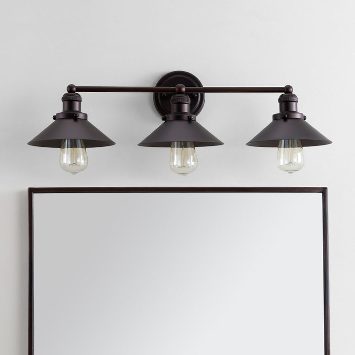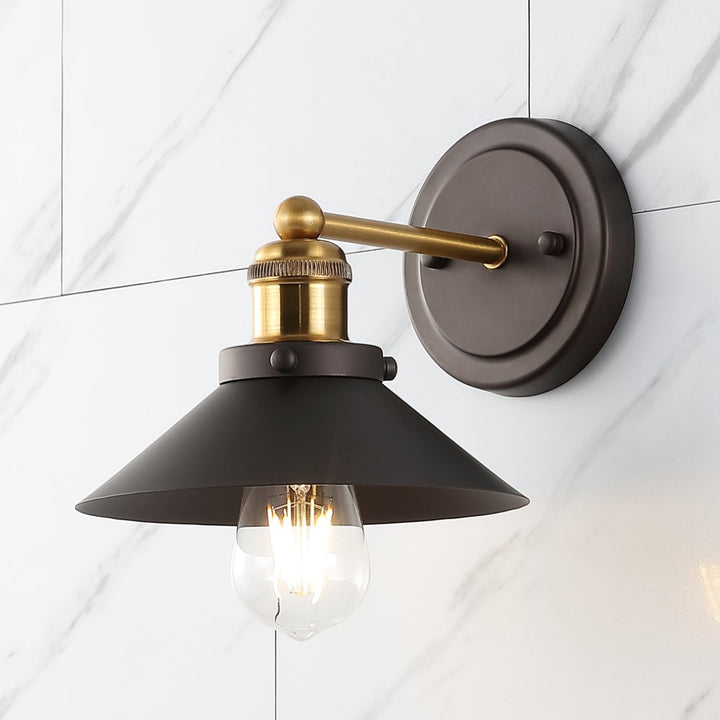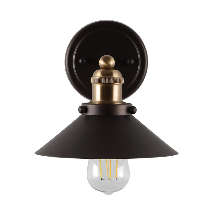 Like a classic barn light but in a modern shape and smaller scale, this classic design features a metal cone shade that conceals the top half of the bulb -- perfect for a clean, industrial look. In a matte orb finish, this sconce is perfectly at home on either side of a bathroom mirror or as extra lighting in kitchens, where your hardware truly shines. Also available in multi-light configurations, the geometric shape adds elegant interest to any space.