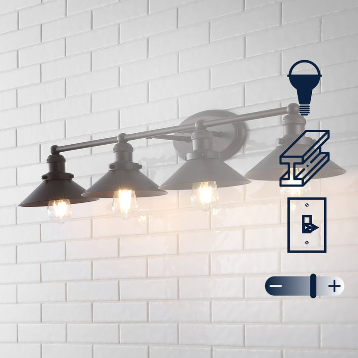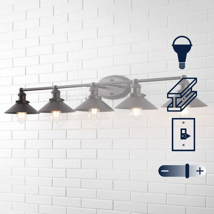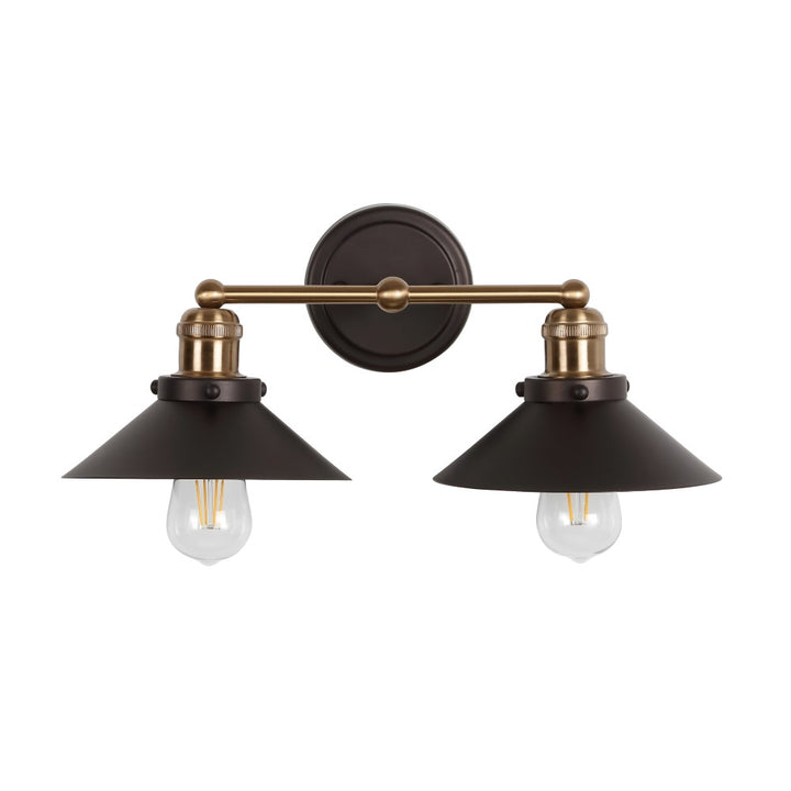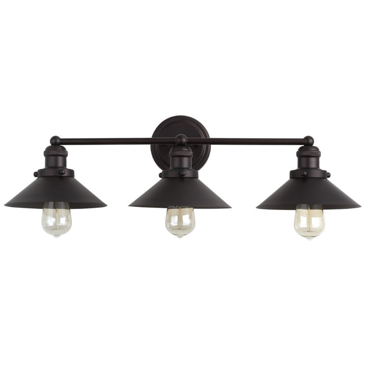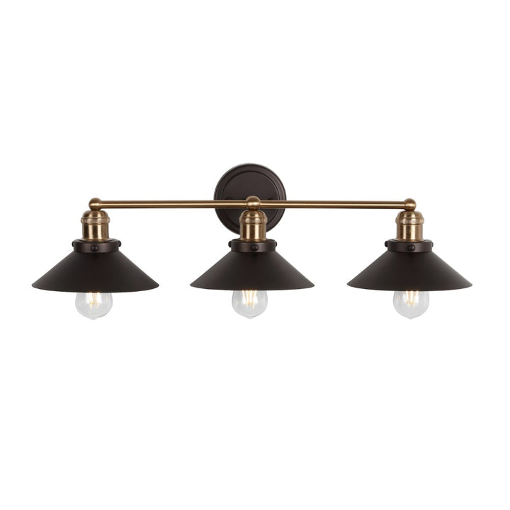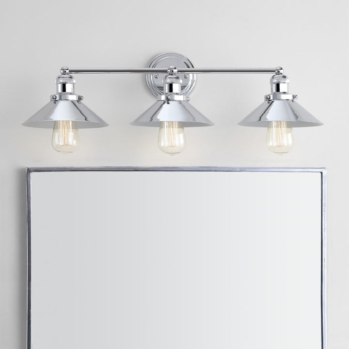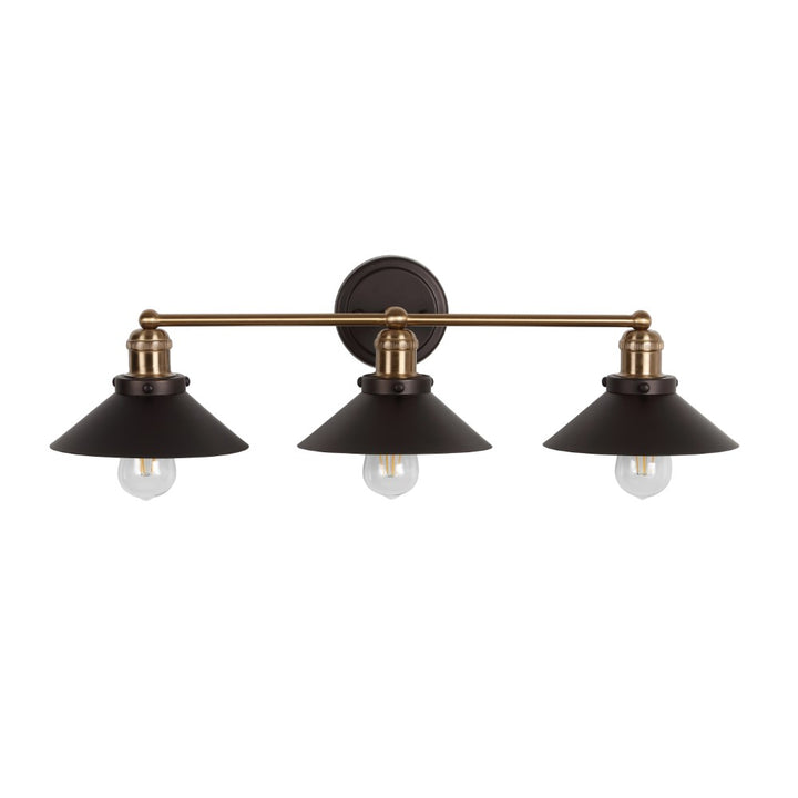 Like a classic barn light but in a modern shape and smaller scale, this classic design features a metal cone shade that conceals the top half of the bulb -- perfect for a clean, industrial look. In a matte orb finish, this sconce is perfectly at home on either side of a bathroom mirror or as extra lighting in kitchens, where your hardware truly shines. Also available in multi-light configurations, the geometric shape adds elegant interest to any space.
