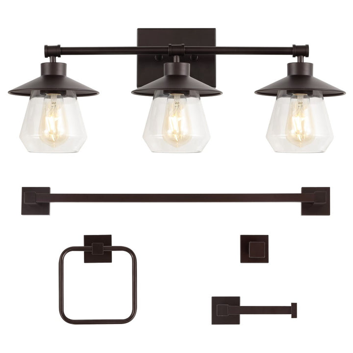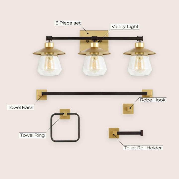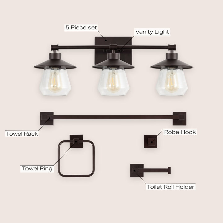 - 5-piece bathroom set includes a vanity light, towel bar, towel ring, toilet roll holder, and robe hook