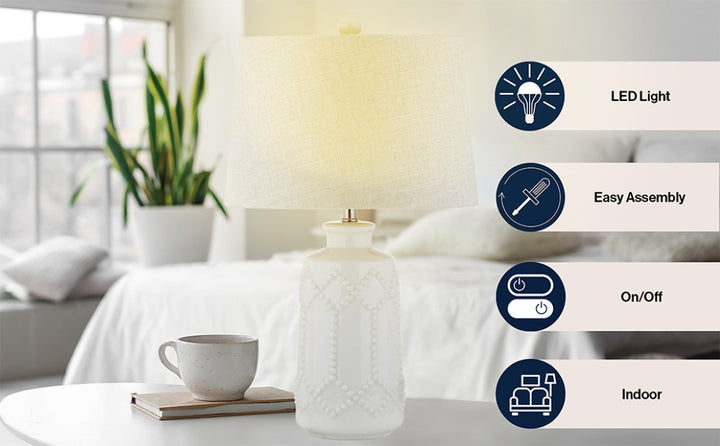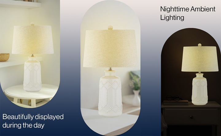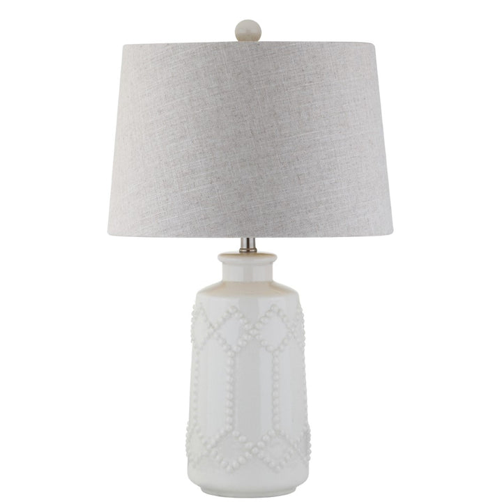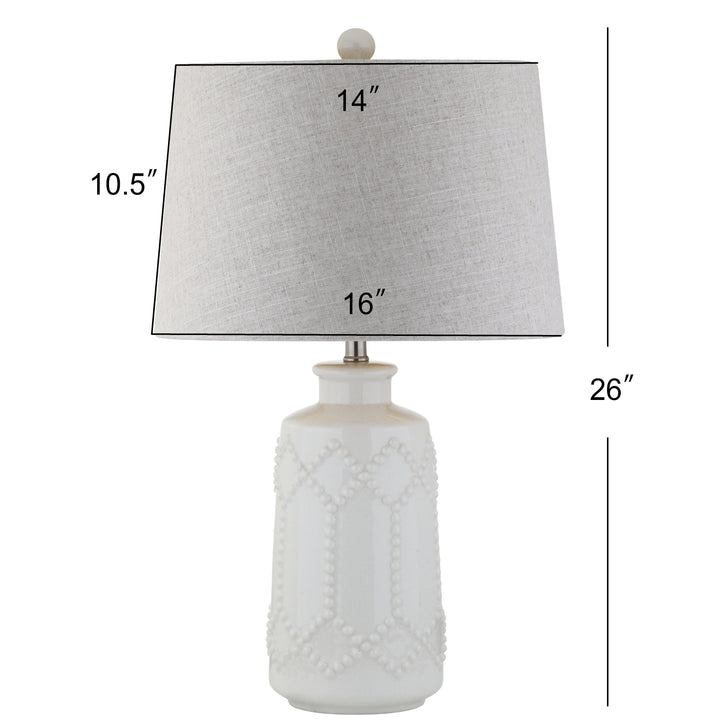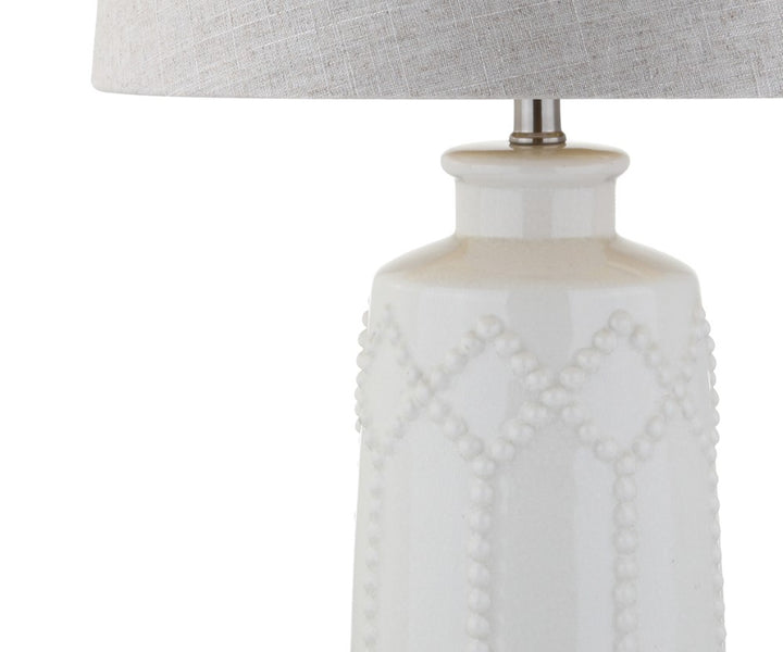 Cream-glazed ceramic shines under the natural gray cotton shade in this transitional table lamp. Well-suited for nightstands or living spaces, at 26" high it is a generous dimension for adding light and style to any space. We love the textured baubles in a geometric trellis pattern on the base, adding a boho vibe to an otherwise classic style.