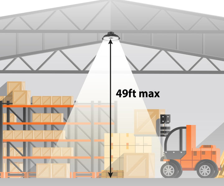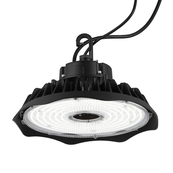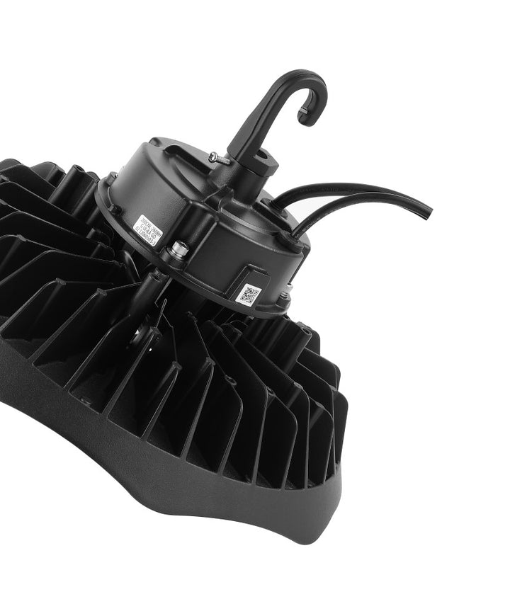 Flood your high-ceilinged spaces with bright, white light by installing our High Bay LED industrial fixtures. Use them outdoors in a covered work area or patio. This round, black industrial light is an ideal lighting solution for work shop, garage, warehouse, office, gym, or retail. Compatible with LED dimmer switches, integrated LED lights reduce energy use by up to 80%, and eliminate maintenance costs. Increase energy efficiency, with automatic shutoff when rooms are not in use. Durable aluminum construction is backed by a 5 year warranty.