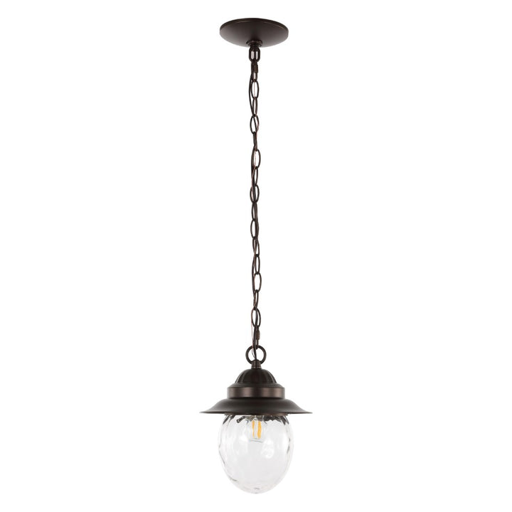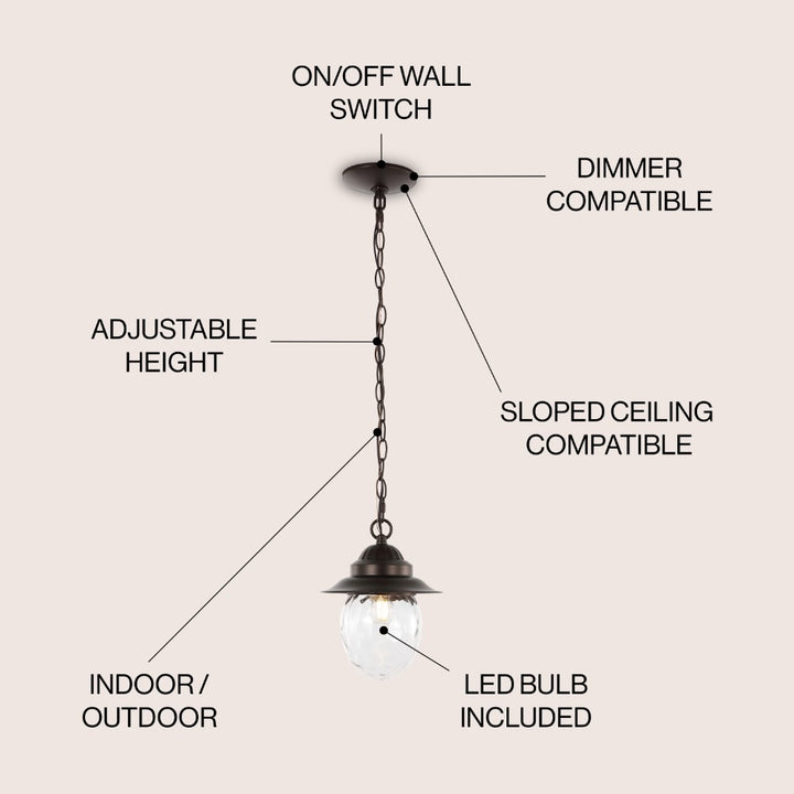 The durable metal shade has an oil-rubbed bronze finish, with a clear glass dimpled globe to protect the LED bulb